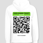 De SCAN ME hoodie is niet zomaar een kledingstuk, het is een interactieve ervaring. De achterkant heeft een QR-code die je kunt personaliseren met je eigen tekst. De tekst “Durf te scannen” zorgt ervoor dat je een nieuwsgierigheid opwekt bij anderen. Maak de hoodie uniek door de code aan te passen aan jouw wensen.