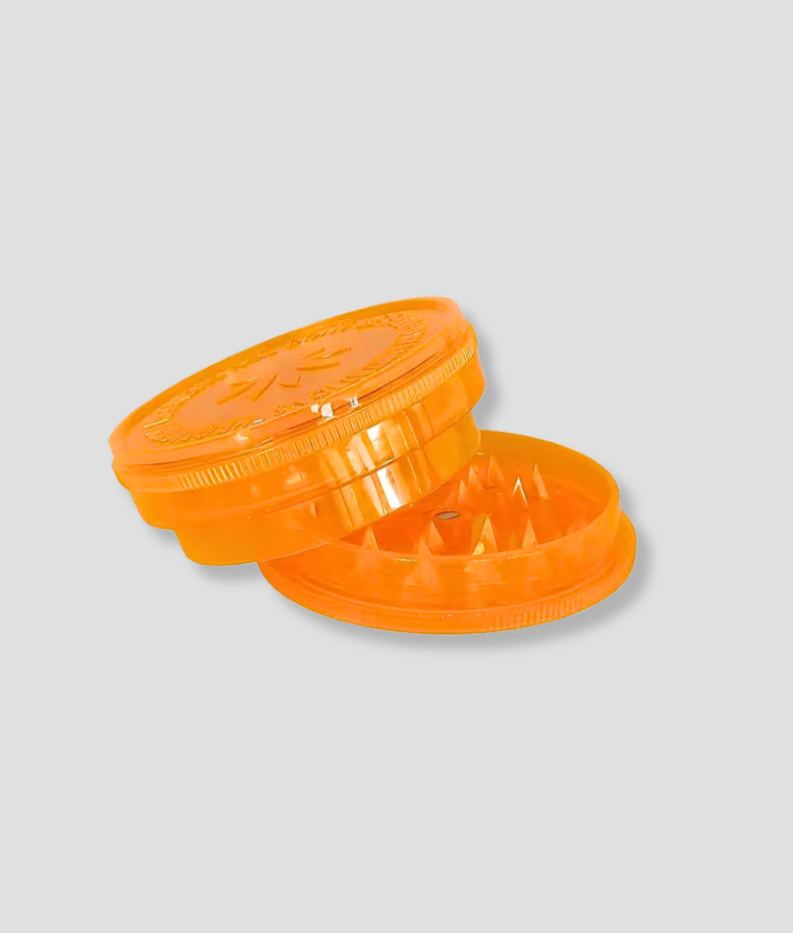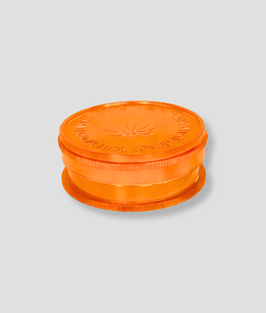 Oranje kunststof grinder om “kruiden” snel fijn te malen. Licht en makkelijk mee te nemen.