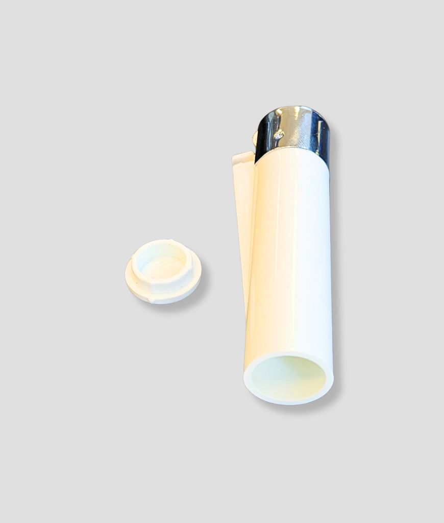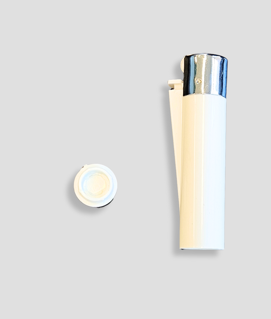 Amigo, dit is de Aansteker Opbergvakje. De ultieme in-plain-sight truc. Dit witte opbergvakje lijkt op een gewone aansteker, maar niemand die ziet dat het in werkelijkheid alleen een geheim opbergvakje is voor je zooi. De aansteker heeft wel een ontsteker erin, dus je kan een vonkje maken als je hem gebruikt, maar er is geen vlam. Je levert geen half werk, dit is je georganiseerde, discrete overlevingskit voor de oblivion.
