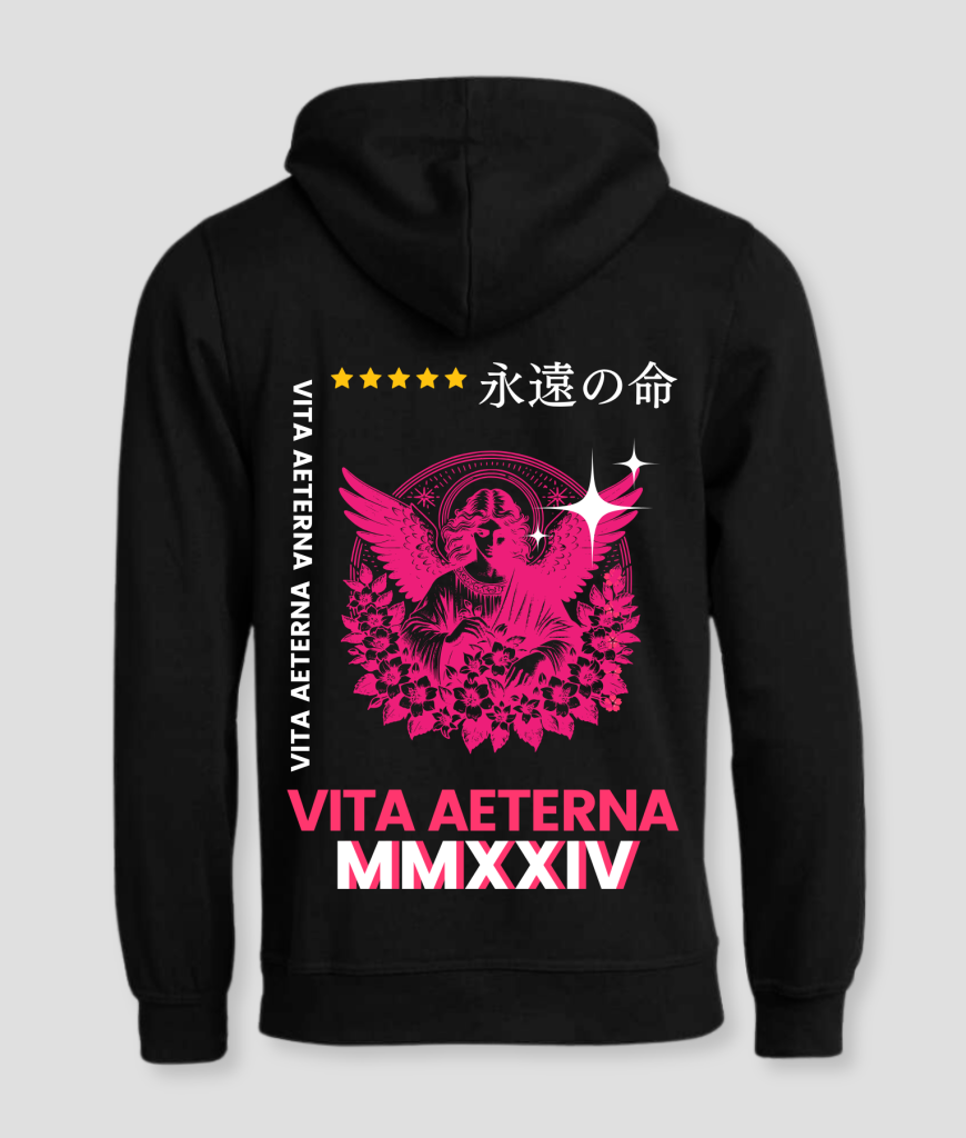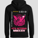 Zwarte hoodie met felroze engelprint, Japanse karakters en Romeinse cijfers. Comfortabele fit en een mystieke, opvallende uitstraling. Perfect voor alternatieve streetwear met betekenis.