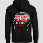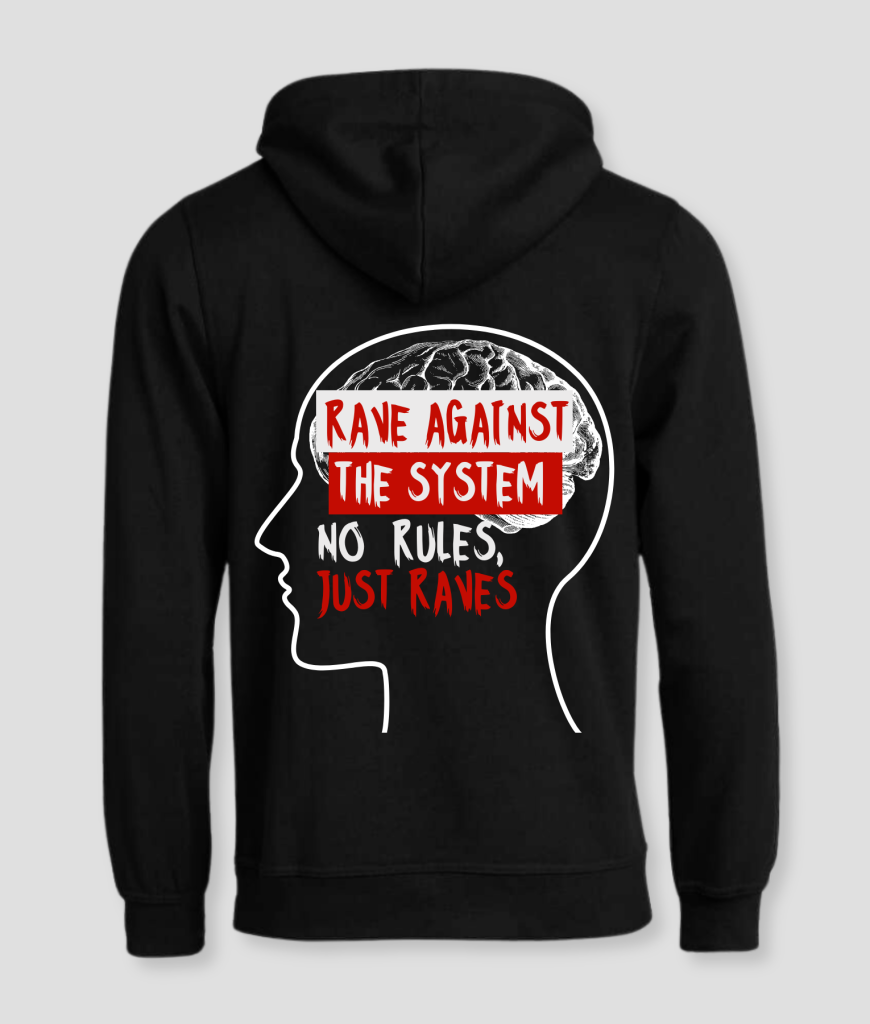 De Against the System hoodie draait om rauwe energie, vrije expressie en de vibe van een echte rave cultuur. De grote illustratie van een hoofd met zichtbaar brein en felrode tekstblokken trekt meteen je aandacht. Het contrast tussen zwart, wit en rood geeft het geheel een scherpe, opvallende look die voelt alsof je een protestposters draagt. De tekst legt de nadruk op onafhankelijk denken en leven zonder opgelegde regels. Precies het soort statement waar veel studenten zich in herkennen.