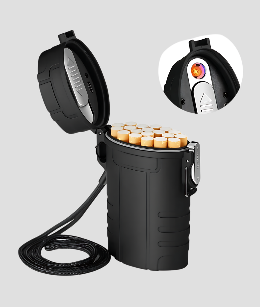 Deze houder is een meesterwerk in efficiëntie. Hij is perfect om al je sigaretten en andere essentials veilig en droog in op te bergen. En het beste? Je kunt gemakkelijk ook je sigs mee aansteken, want deze houder is namelijk voorzien van een oplaadbare aansteker. Geen gedoe met natte sigaretten of een verloren aansteker. Alles bij de hand, alles droog, alles ready to go. De oplaadbare functie zorgt ervoor dat je altijd een betrouwbare hittebron hebt.