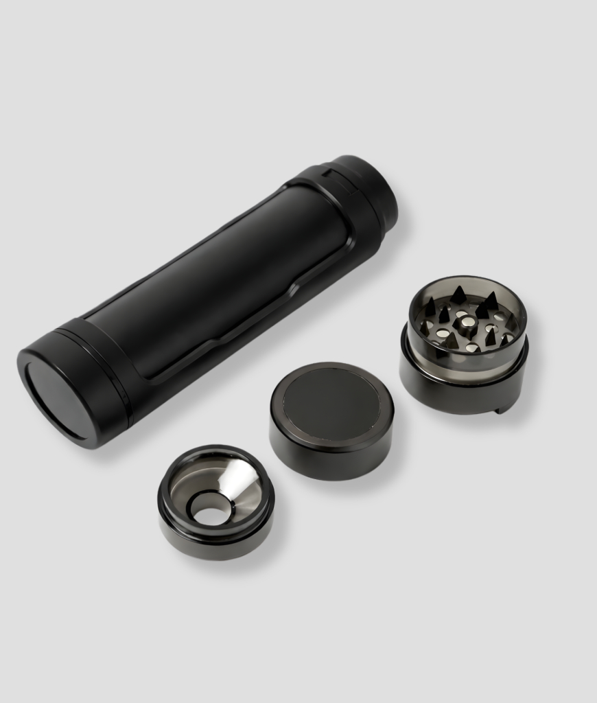 Maak je festival uitrusting compleet met deze strakke, matzwarte all-in-one grinder en stash tube. Perfect om je essentials onopvallend, veilig en droog mee te nemen naar elke rave of huisfeestje, zodat jij altijd klaar bent voor het volgende moment.