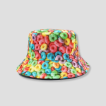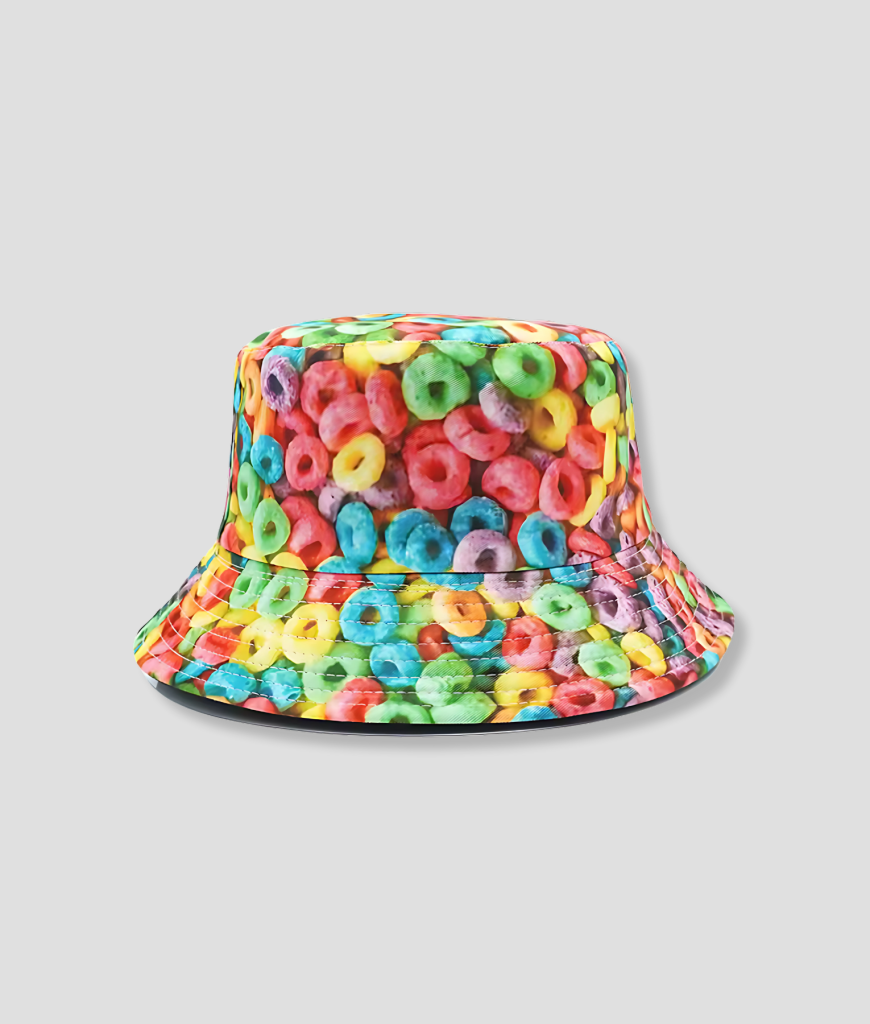 Een strakke, helderwitte bucket hat als basis, maar compleet overspoeld door een knalroze, geel, groen en blauw patroon dat direct doet denken aan de meest iconische, kleurrijke ontbijtgranen. De boodschap is brutaal en trekt direct de blikken: ik heb mijn dagelijkse dosis vrolijkheid op mijn hoofd. Het is een gewaagde, humoristische statement piece die de discussie over je favoriete jeugdserie start.