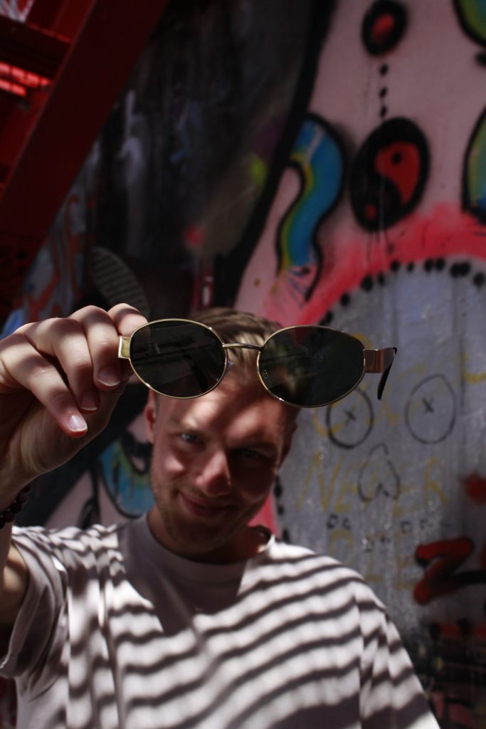 Amour is minimal met charme. Dat slanke, goudtint frame tekent je gezicht als een fijne lijntekening, terwijl de ronde, donkergetinte lenzen je blik warm en mysterieus houden. Het oogt vintage—denk aan oldschool rock-’n-roll en terrassen aan het water—maar dan strak genoeg voor de techno bunker. In het zonlicht gloeit het metaal zacht, onder de lasers vangt het net genoeg glans om je silhouette te laten spreken. Het is de bril die fluistert “ik ben er” en toch iedereen laat kijken.