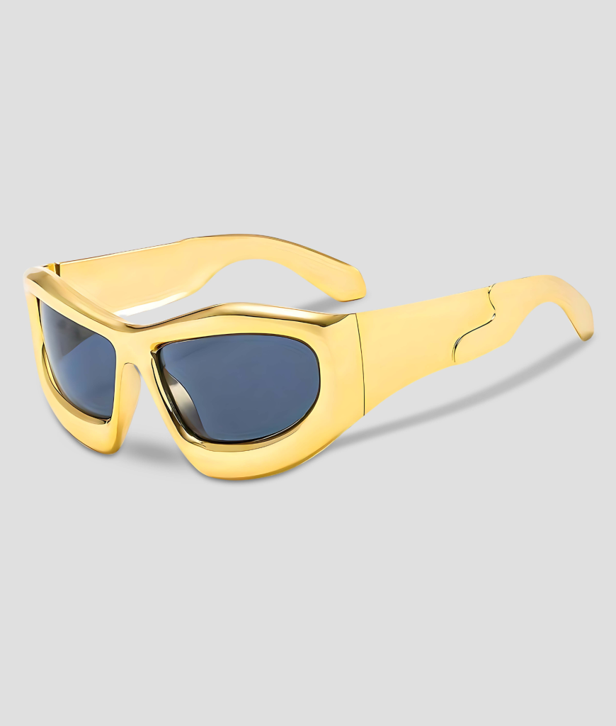 Astronia is Y2K–space met een dikke knipoog. Het glanzende gouden frame pakt elk straaltje zon en elke laser alsof het speciaal voor jou is ingesteld. De wraparound vorm trekt strak langs je wangen en geeft je profiel die futuristische, bijna vloeibare look. De diepe, smoke lens houdt je blik koel en mysterieus: techno-bunker, hardstyle-main, clubn8t—overal oogt het alsof je rechtstreeks van de stage komt. Amigo, dit is glans met attitude.