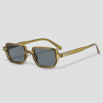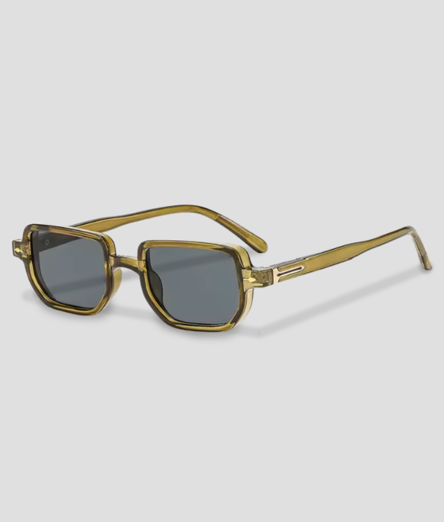 Zonnebril met vierkant model, transparant geel frame en donkere glazen. Licht en strak.
