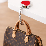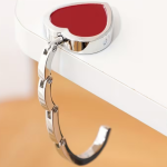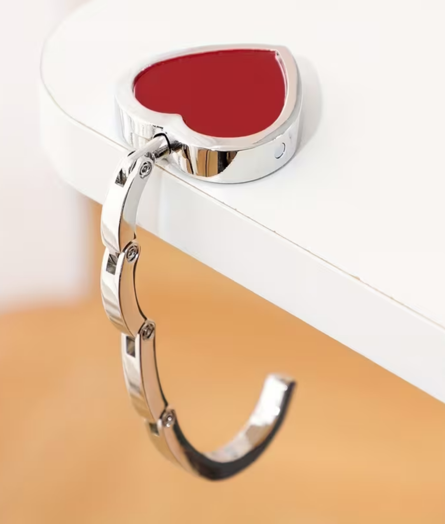 Ken je dat? Je staat even lekker bij te komen aan een tafeltje op het foodcourt of leunt gezellig aan de bar, maar de vloer is één grote, plakkerige bende van gemorst bier. Waar laat je je tas? Deze slimme tassenhaak met een schattig rood hartje is jouw absolute redding! Je klapt hem in een seconde uit, legt de platte kant op tafel en hangt je tas veilig en schoon aan de haak. Jouw spullen blijven fris, veilig in het zicht en jij hebt je handen vrij om volop te genieten van je drankje.