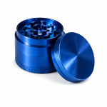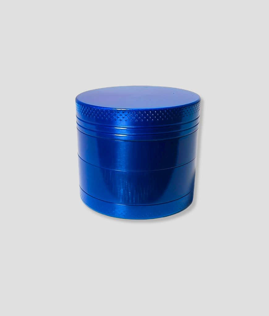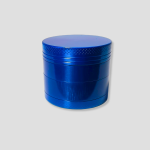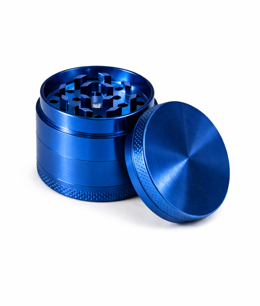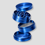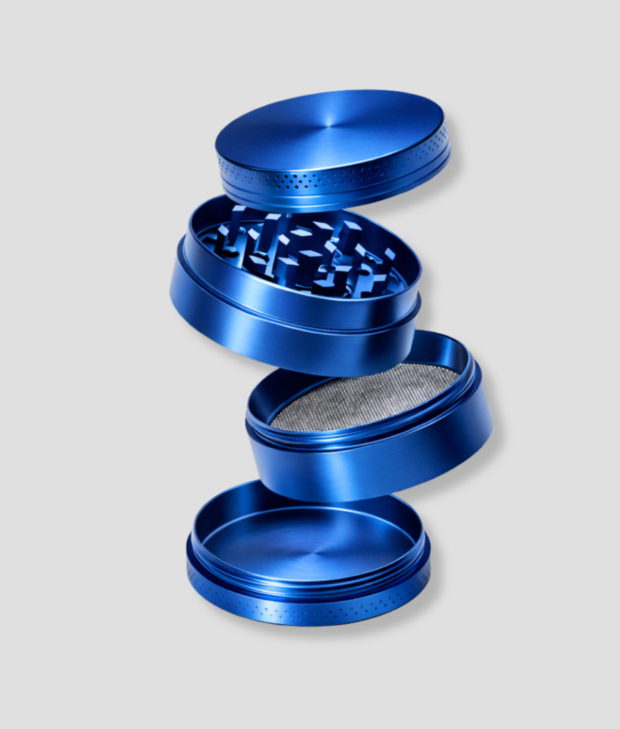 Blauwe metalen grinder met meerdere lagen en zeef. Handig om “kruiden” snel en gelijkmatig fijn te malen.