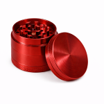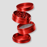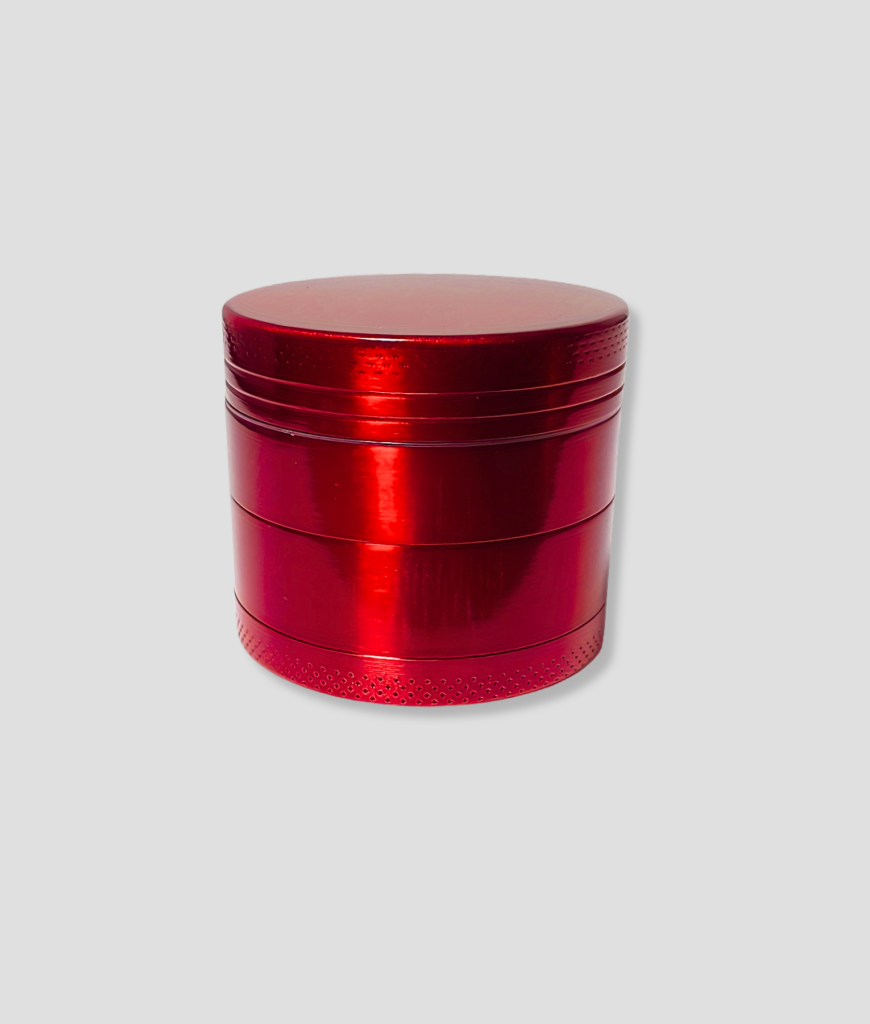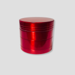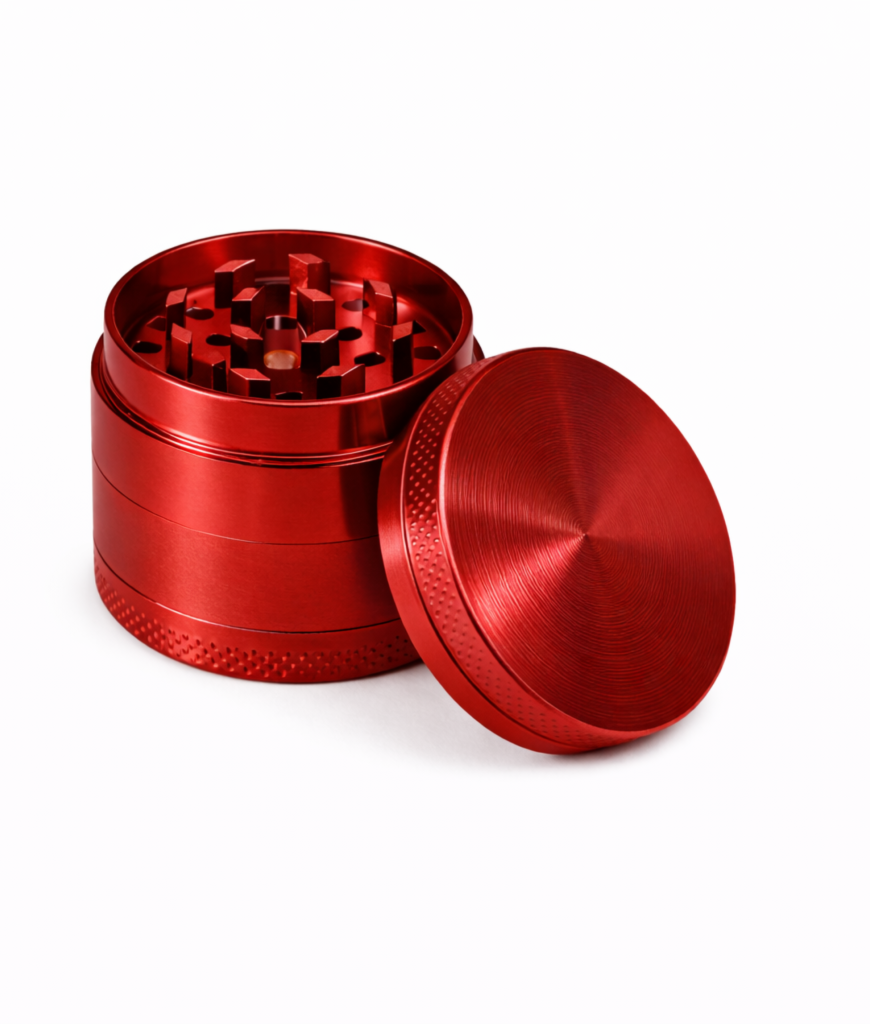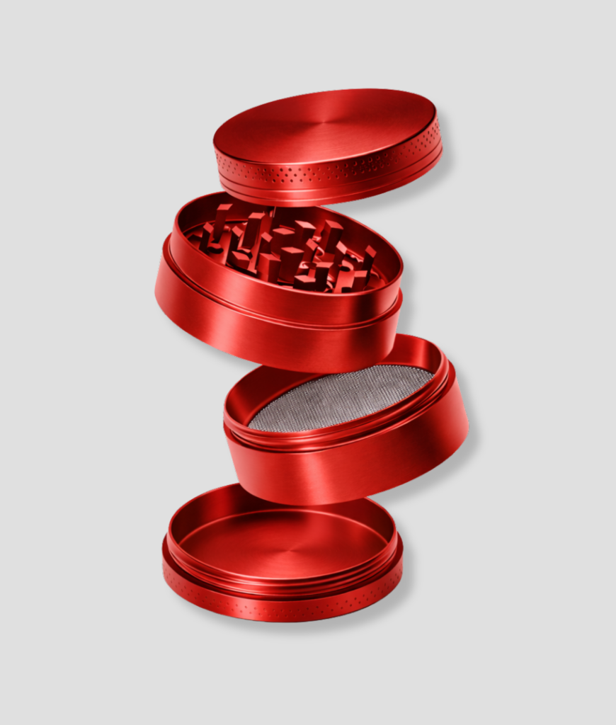 Rode metalen grinder met meerdere lagen en zeef. Handig om “kruiden” snel en gelijkmatig fijn te malen.
