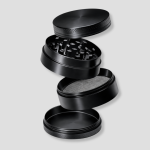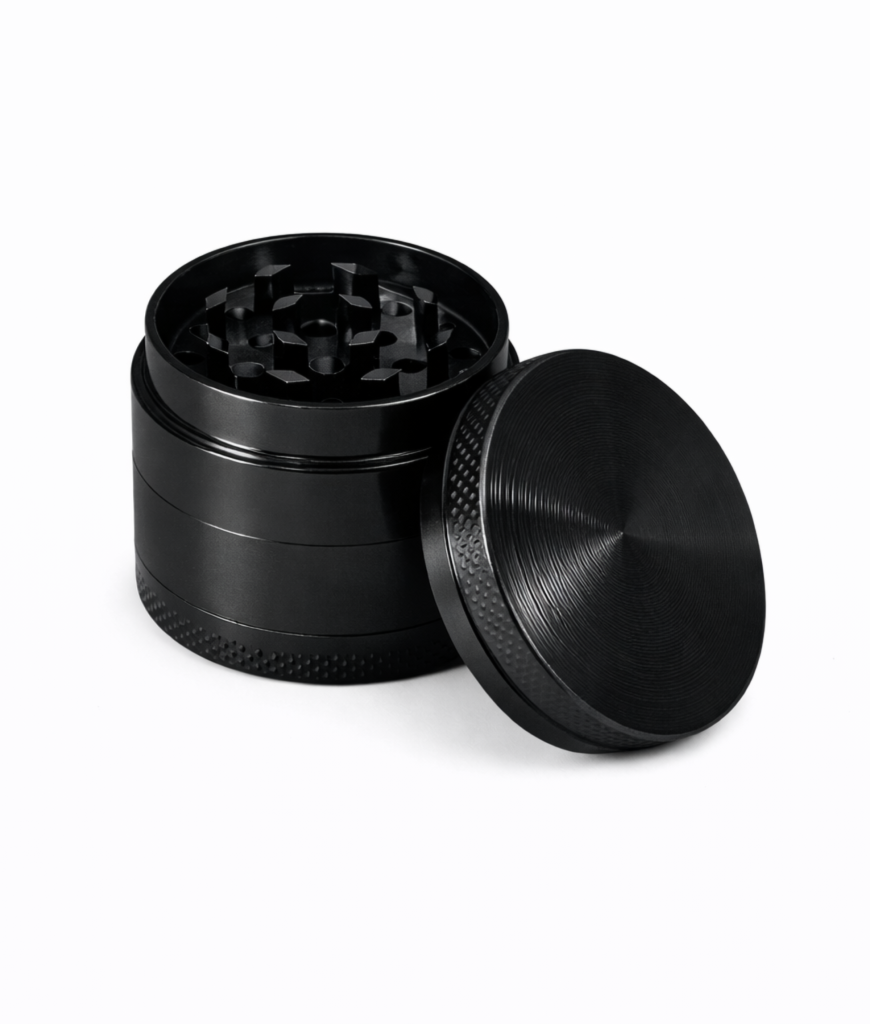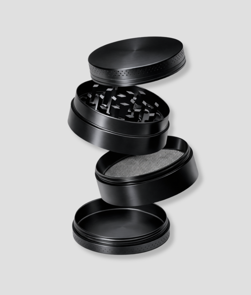 Metalen grinder met meerdere lagen en zeef. Handig om “kruiden” fijn te malen voordat je gaat rollen.
