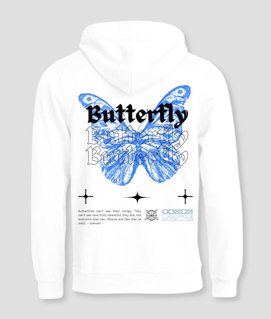 Met de Butterfly Hoodie maak je niet alleen een mode-statement, maar draag je ook een boodschap van zelfacceptatie en schoonheid uit. Het is de perfecte hoodie voor iedereen die zich wil uitdrukken en opvalt met een uniek en betekenisvol ontwerp.