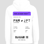 Met de boarding pass hoodie maak je niet alleen een statement, je creëert ook een outfit die helemaal jouw eigen is. De paarse label aan de bovenkant maakt het een unieke hoodie, terwijl de boarding pass print de perfecte achtergrond biedt voor je persoonlijke tekst. Kies je eigen plaatsnaam, voeg een boodschap toe, en maak een hoodie die echt bij jou past.