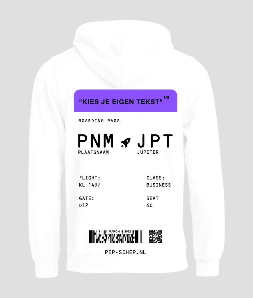 Met de boarding pass hoodie maak je een statement waar je ook gaat. Personaliseer de tekst naar wens en draag een uniek ontwerp dat niemand anders heeft. Het is de perfecte manier om je eigen stijl uit te drukken!