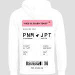 Met de boarding pass hoodie maak je niet alleen een statement, je creëert ook een outfit die helemaal jouw eigen is. Het roze label aan de bovenkant maakt het een unieke hoodie, terwijl de boarding pass print de perfecte achtergrond biedt voor je persoonlijke tekst. Kies je eigen plaatsnaam, voeg een boodschap toe, en maak een hoodie die echt bij jou past.