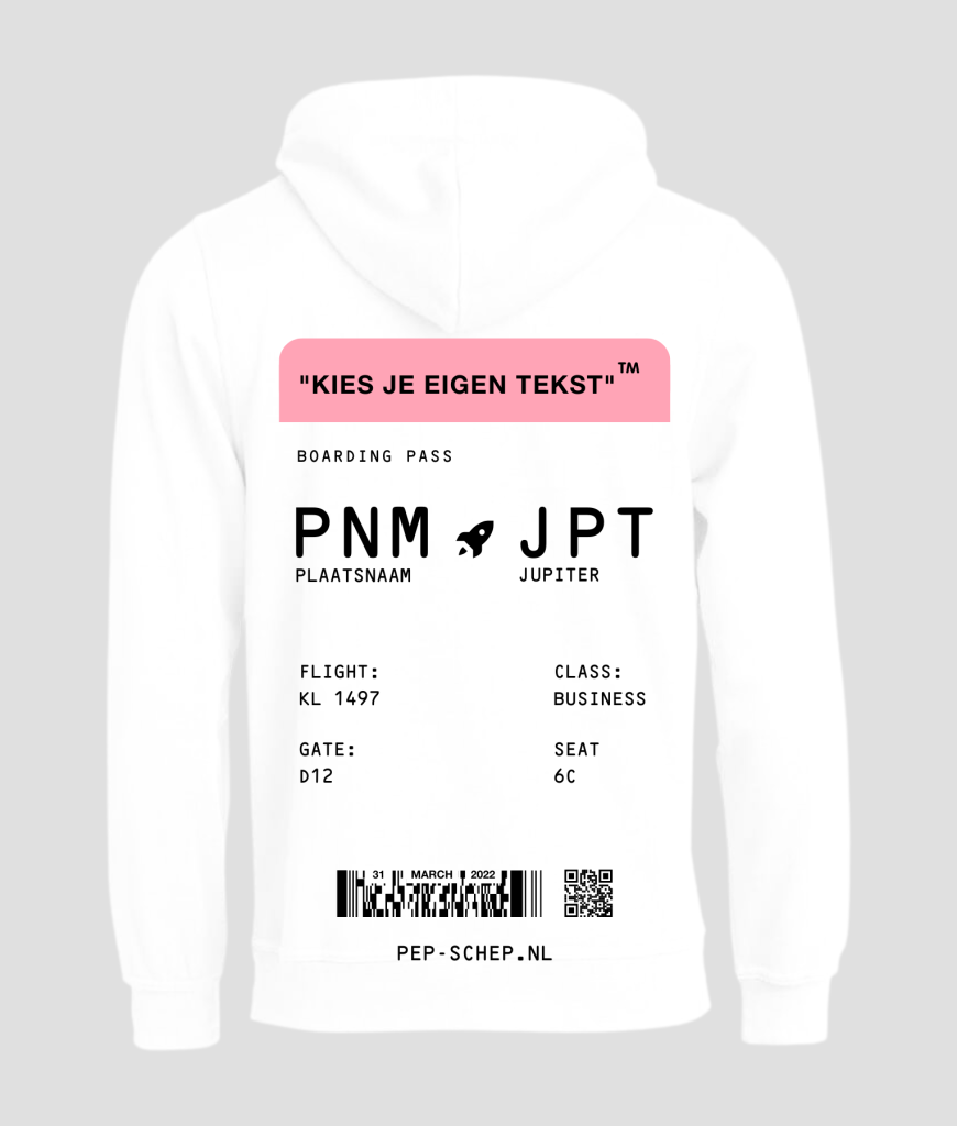 Met de boarding pass hoodie maak je een statement waar je ook gaat. Personaliseer de tekst naar wens en draag een uniek ontwerp dat niemand anders heeft. Het is de perfecte manier om je eigen stijl uit te drukken!