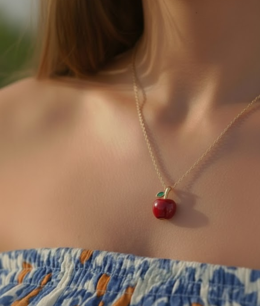 Een klein rood appeltje — glanzend, cute, maar tóch stijlvol. Niet kitsch, niet kinderlijk. Gewoon fun. Alsof je zegt: ja, ik neem het leven serieus, maar niet té serieus. Dit is de vibe van spontaan een drankje doen, zonder plan, en eindigen in een avond waar iedereen over napraat.