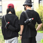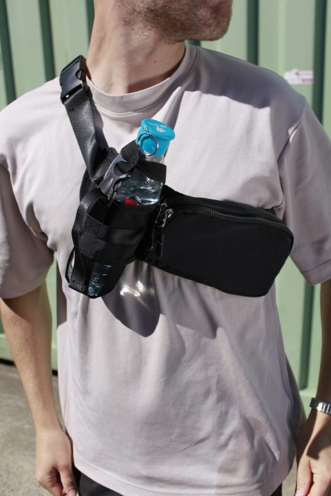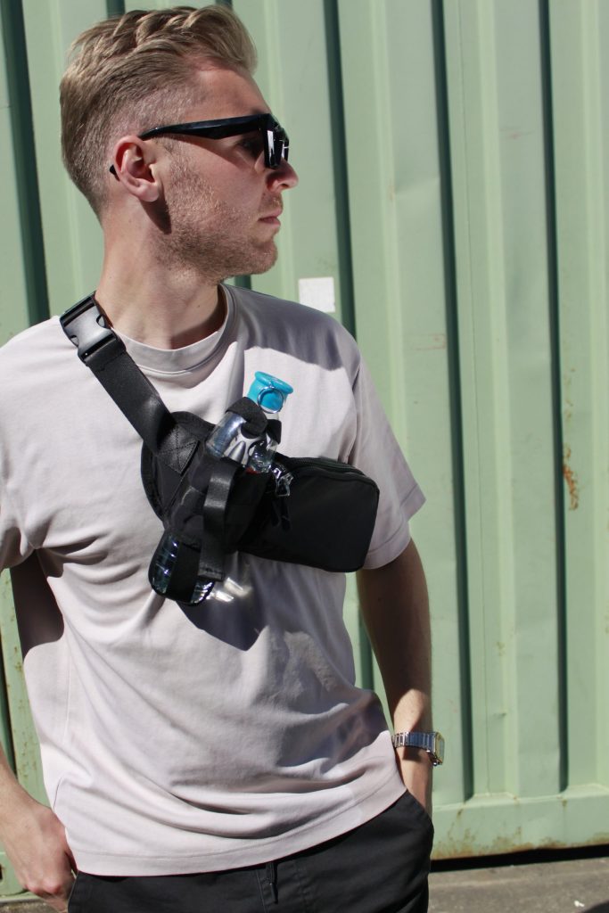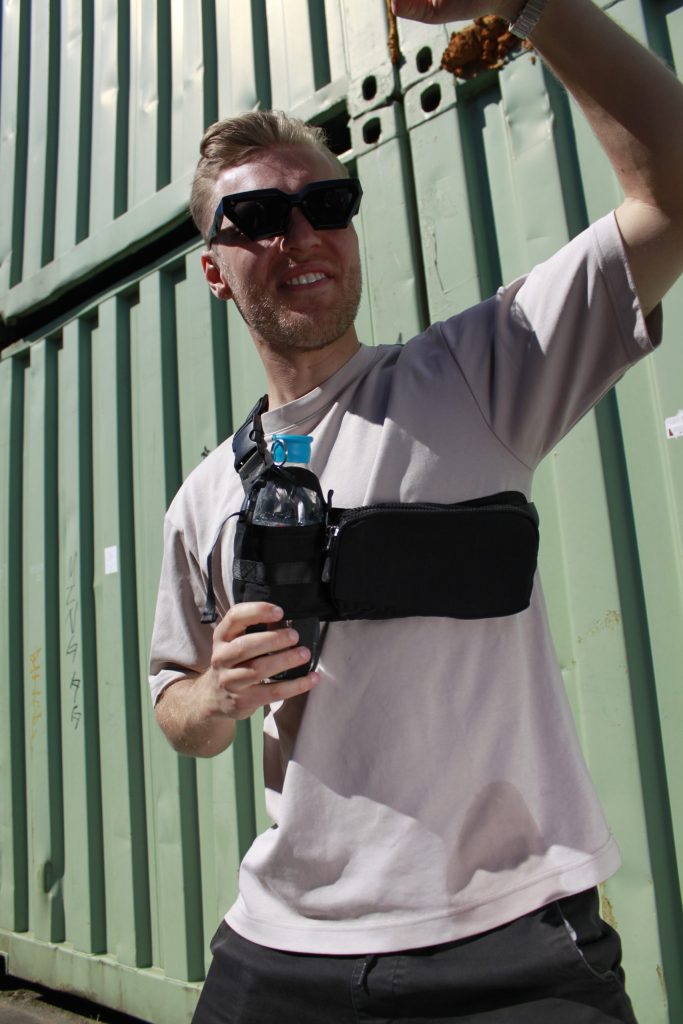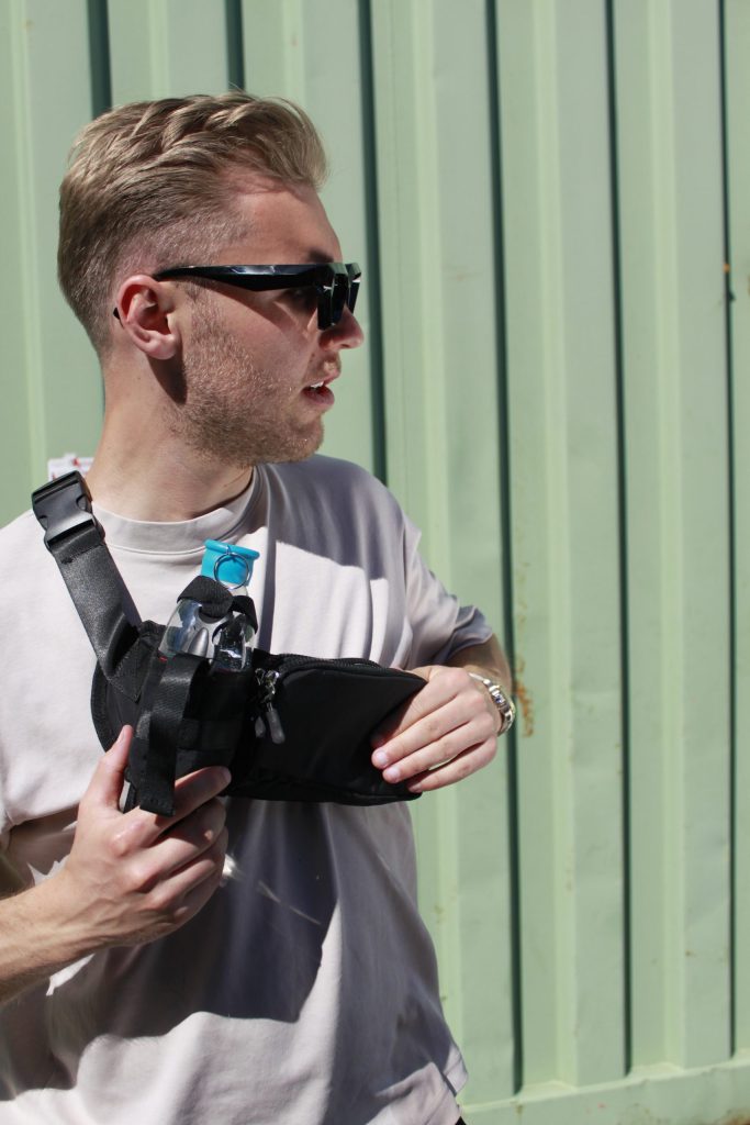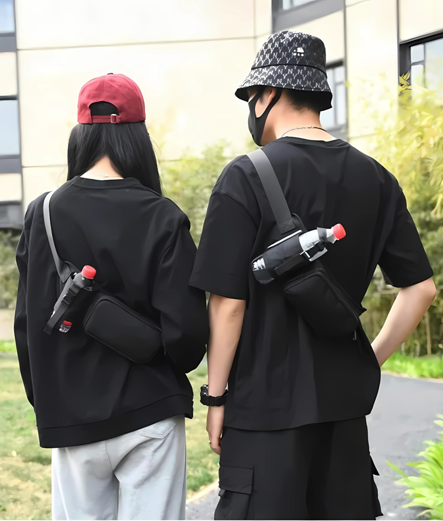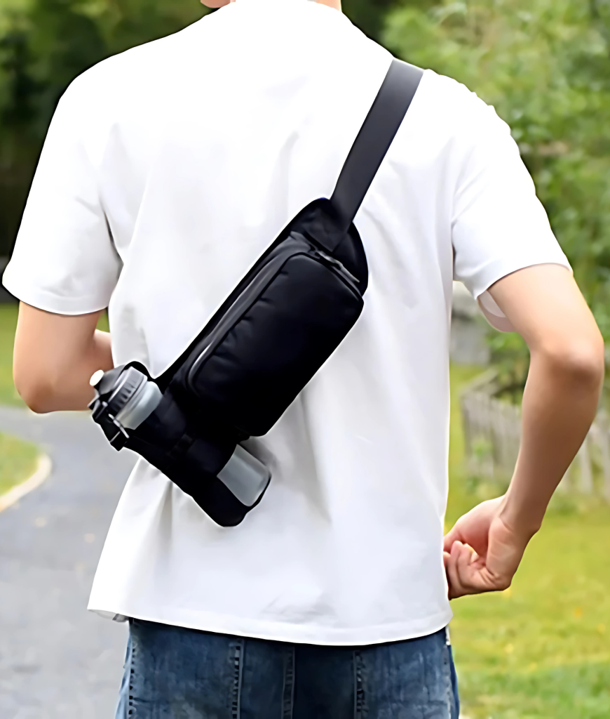 Strak zwart en sportief, met een stevige holster die je waterflesje strak vastgrijpt en een ruime pouch voor de rest. De rits loopt soepel, de vorm blijft low-profile zodat je makkelijk door de menigte snijdt, en de details zijn net stoer genoeg om te matchen met je clubfit. Overdag blendt ‘ie met je outfit, ’s nachts pakt het materiaal precies genoeg licht om clean te ogen zonder te schreeuwen.