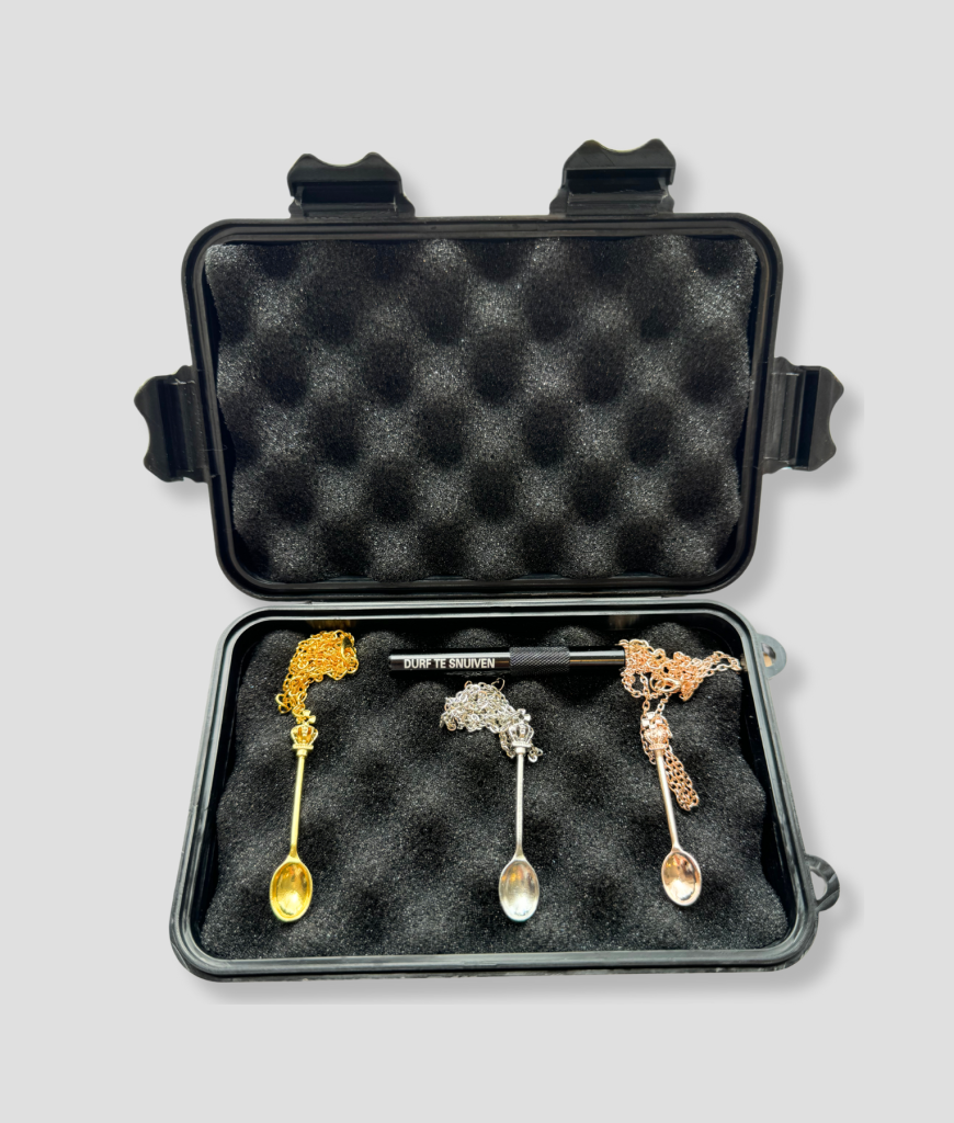Stijlvol, praktisch en helemaal ready voor actie. Deze box heeft alles wat je nodig hebt, en ziet er bovendien nog eens top uit. De schepjes – in verschillende stijlen en afmetingen – passen perfect in de doos, zodat je alles georganiseerd en veilig kunt opbergen. De snuifbuis is een must-have voor de serieuze festivalganger, en de box zelf zorgt ervoor dat alles netjes op zijn plek blijft, ongeacht hoe wild het feestje wordt. Het is geen rommelige tas, het is je festival-organizer in stijl.