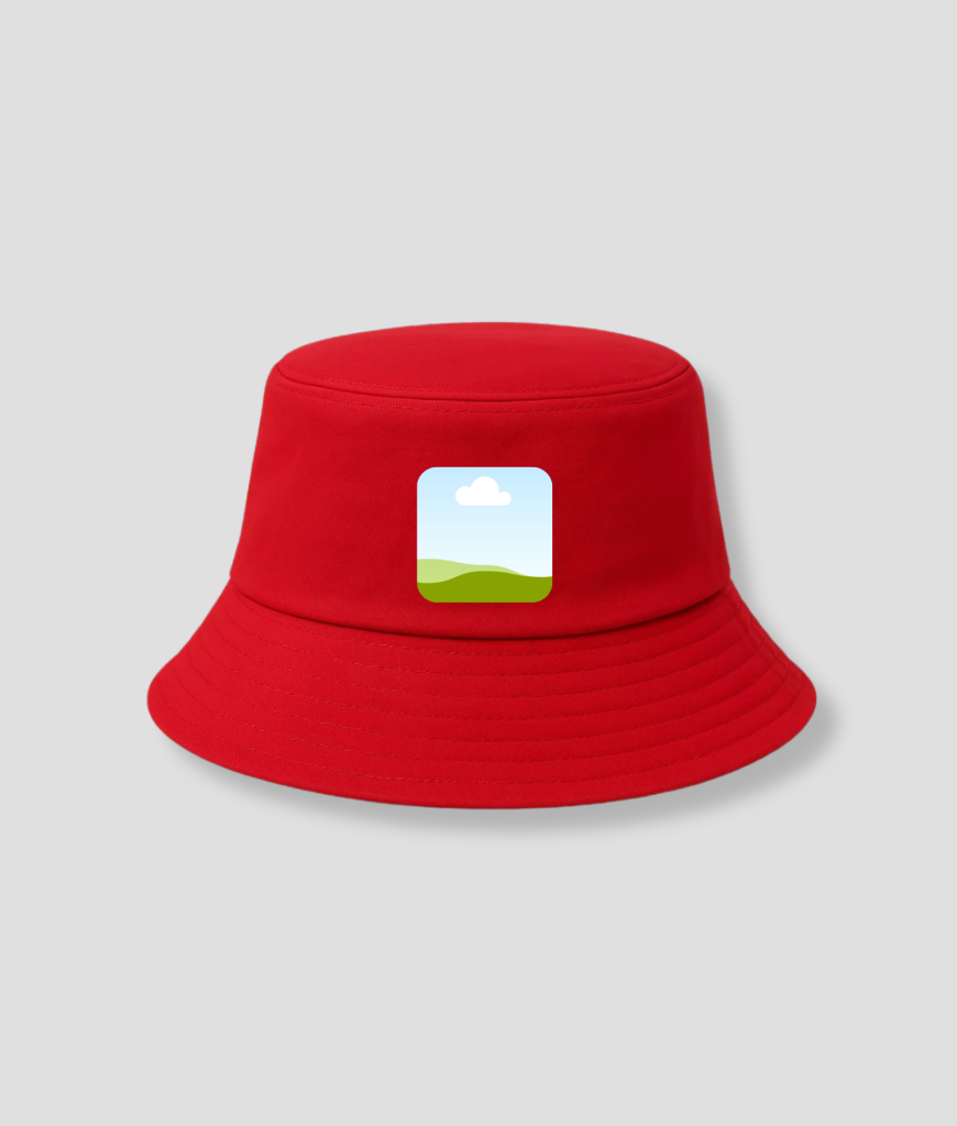 Deze bucket hat doet niet aan rustig opgaan in de massa. Rood trekt aandacht, punt. Met jouw foto erop wordt het geen standaard hoed, maar iets waar mensen automatisch naar kijken. Of ze het snappen is bijzaak.