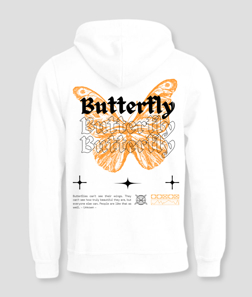 De Butterfly Hoodie met de oranje vlinderprint is een krachtig mode-item. De tekst “Butterflies can’t see their wings. They can’t see how truly beautiful they are, but everyone else can. People are like that as well.” voegt een diepe betekenis toe aan het ontwerp. Het is niet alleen een hoodie, maar een reflectie van zelfwaardering en schoonheid.