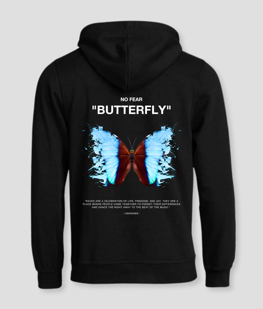 De “No Fear Butterfly” hoodie is een krachtige boodschap van vrijheid, perfect voor iedere raveliefhebber. Met de indrukwekkende vlinderprint en de tekst “NO FEAR” op de achterkant, straalt deze hoodie de essentie van vrijheid en zelfexpressie uit. Het ontwerp symboliseert de kracht van loslaten en jezelf zijn, zonder angst.