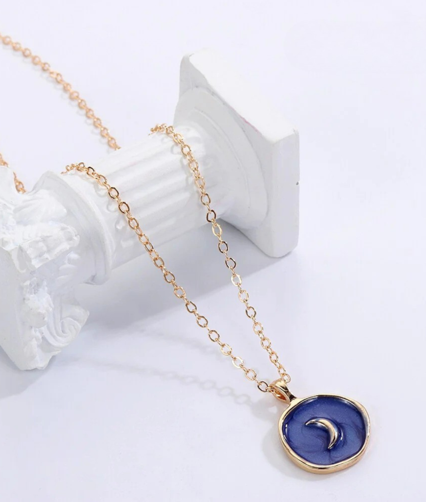 De hanger heeft een gladde paarse basis met een kleine goudkleurige maan die er zacht bovenop ligt. Die combinatie van paars en goud geeft meteen een dromerige, bijna nachtelijke sfeer. Het is zo’n ketting die je moeiteloos draagt met basic outfits, maar die toch genoeg karakter heeft om op te vallen in de juiste setting.