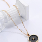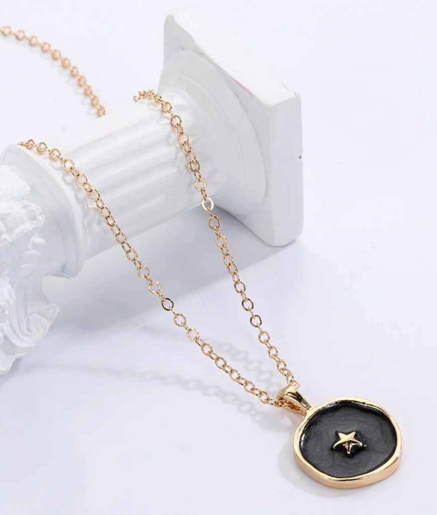 De hanger heeft een zachte, organische vorm met een zwarte basis en een kleine gouden ster in het midden. Het ziet eruit als iets dat je spontaan op een markt in een warm kustplaatsje zou scoren, tussen de strandtenten en de geur van zonnebrand door. Het is minimalistisch maar toch opvallend genoeg om nieuwsgierige blikken te trekken zonder te schreeuwen. Mensen die jouw stijlgevoel snappen, herkennen dit soort sieraden meteen als “die ene ketting” die je steeds weer pakt.