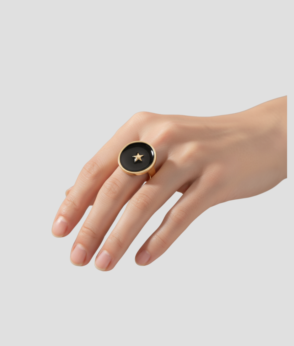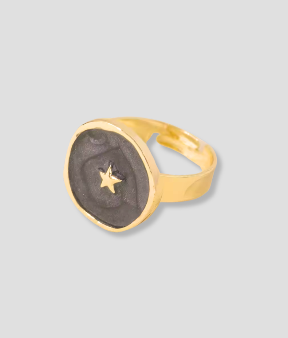 Laat je stijl stralen met deze gouden ring met sterdetail. De diepgrijze steen en glanzende gouden afwerking zorgen voor een unieke, chique look die net even anders is. De ster in het midden geeft een subtiel vleugje magie – perfect voor wie durft te schitteren. Dankzij de verstelbare maat zit hij altijd goed, of je nu gaat voor casual of classy. Een kleine ring met groot karakter.