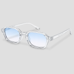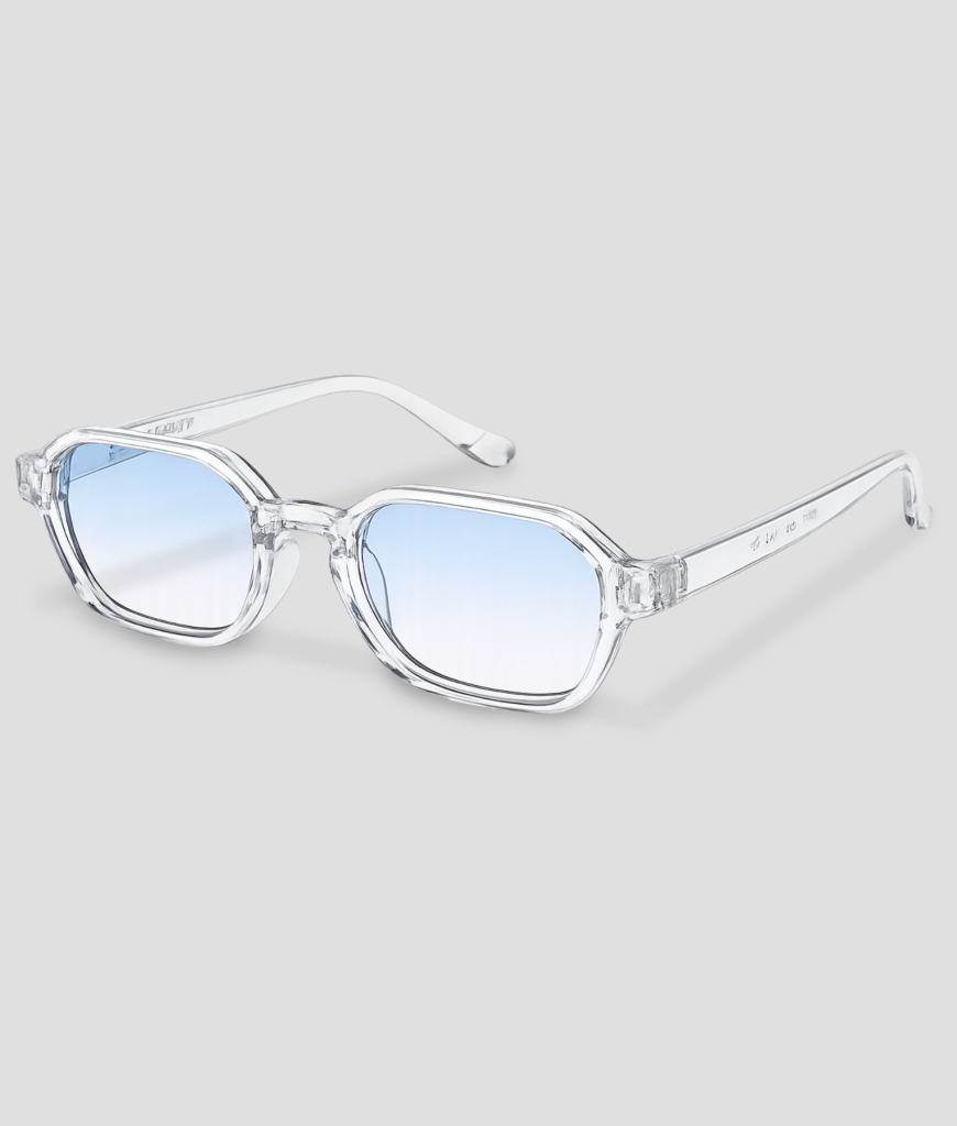 Zonnebril met transparant frame en lichtblauwe lenzen. Fris model dat overal bij past.