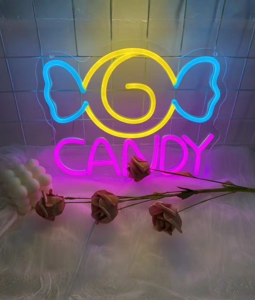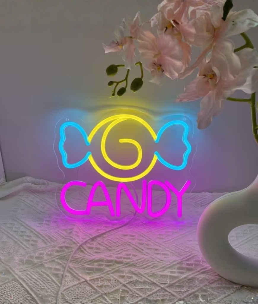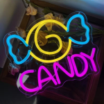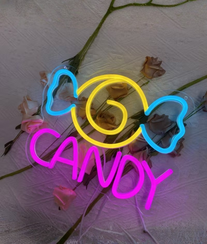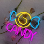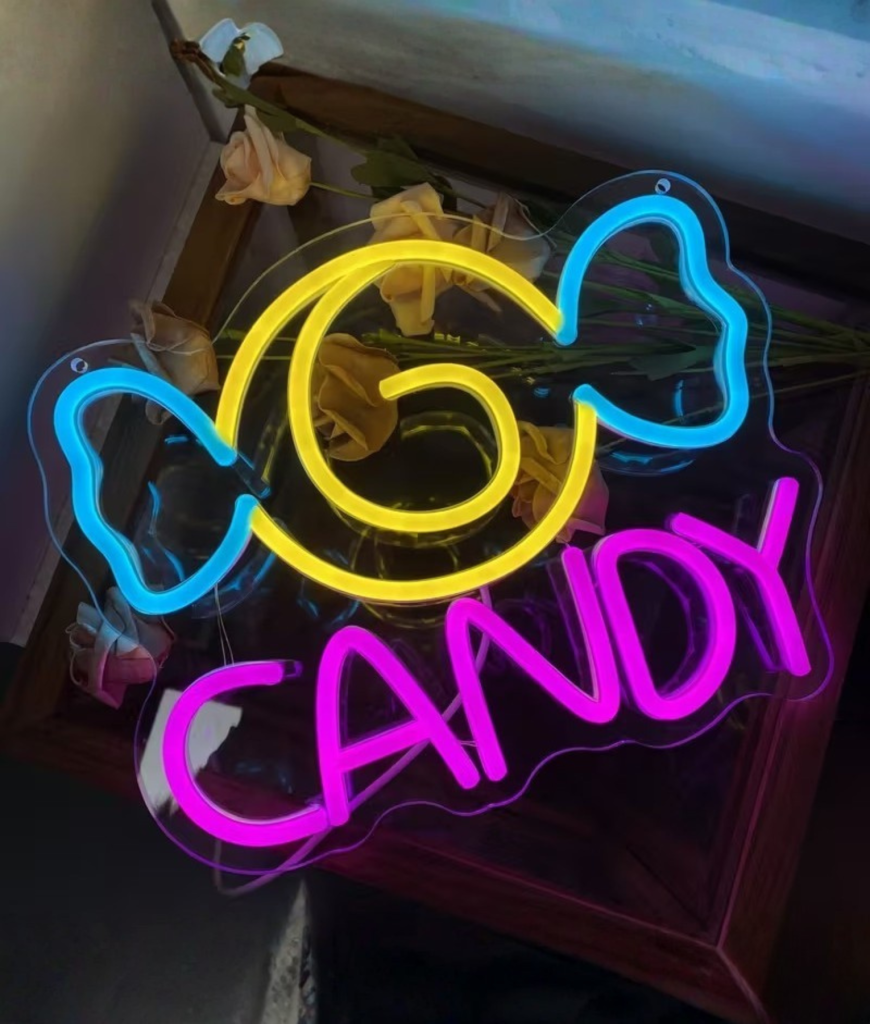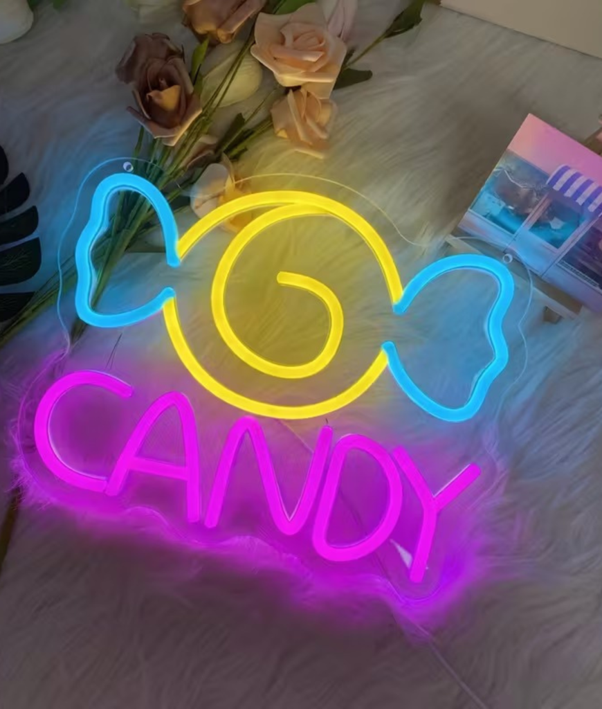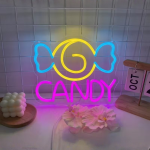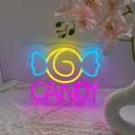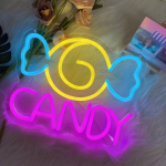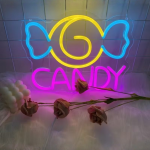 Met zijn gele swirl en blauwe strikvorm is dit neon ontwerp speels zonder kinderachtig te worden. De knalroze CANDY tekst maakt het geheel compleet en trekt meteen de aandacht. Het is strak, opvallend en precies zo fel als jij het stiekem altijd wilde hebben.