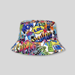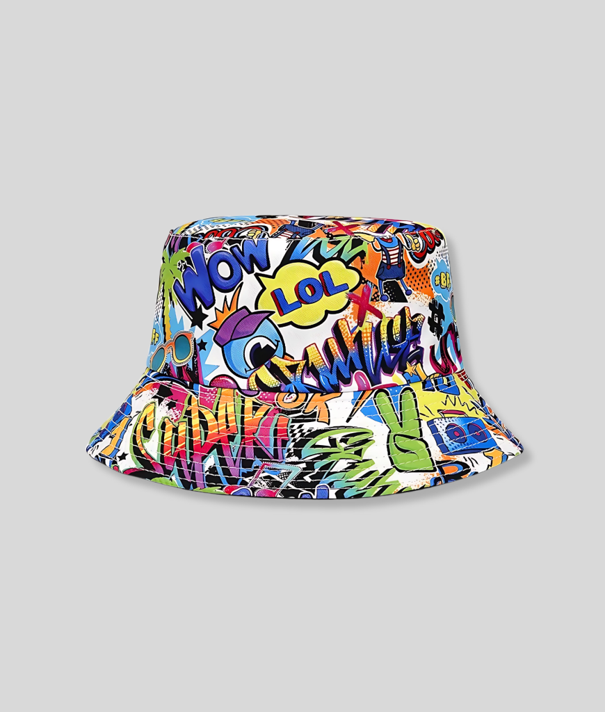 Felle cartoon tekens, graffiti, woorden die eruit knallen alsof ze net luidkeels zijn geschreeuwd in een steeg vol leven. Het is speels maar scherp, druk maar gedurfd. Deze print kijkt niemand voorbij. Dit is die look die zegt: ik ben hier, ik doe mijn ding, en als je het te veel vindt, dan kijk je maar een andere kant op. Op de dansvloer, in de stad, op de camping bij een kampvuurtje om 04:30, deze hat komt altijd goed binnen.