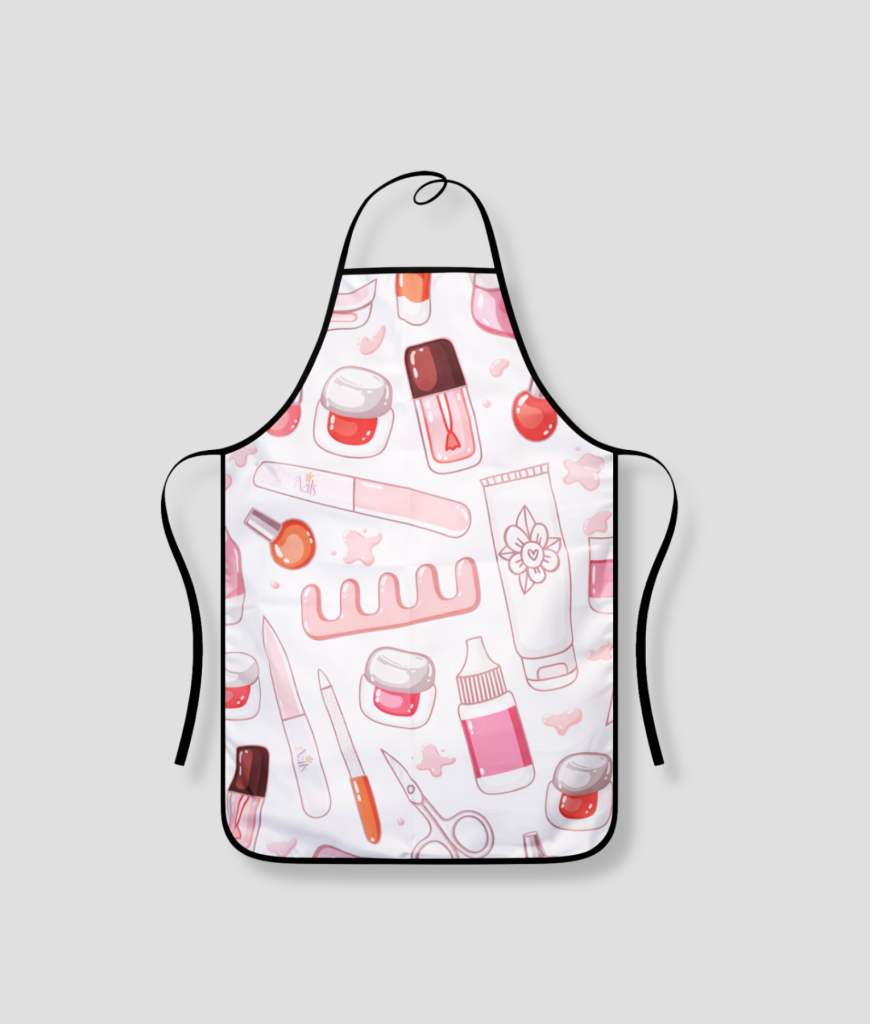 Schort met beauty print van nagellak en tools. Licht, praktisch en leuk voor thuis of als cadeau.