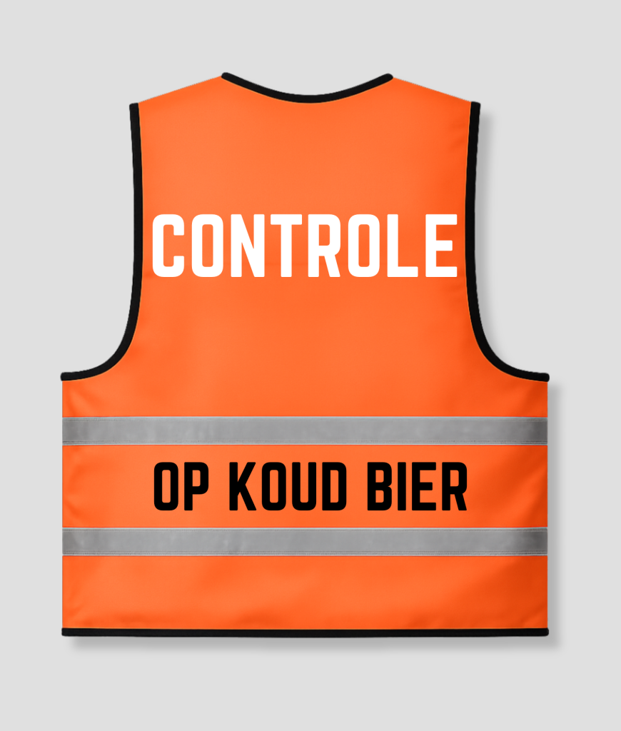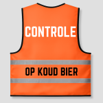 Met dit oranje hesje met de tekst “Controle op koud bier” val je meteen op tijdens een feestje. Het lijkt op een standaard veiligheidshesje, maar de tekst maakt meteen duidelijk dat het hier niet om echte controle gaat.