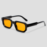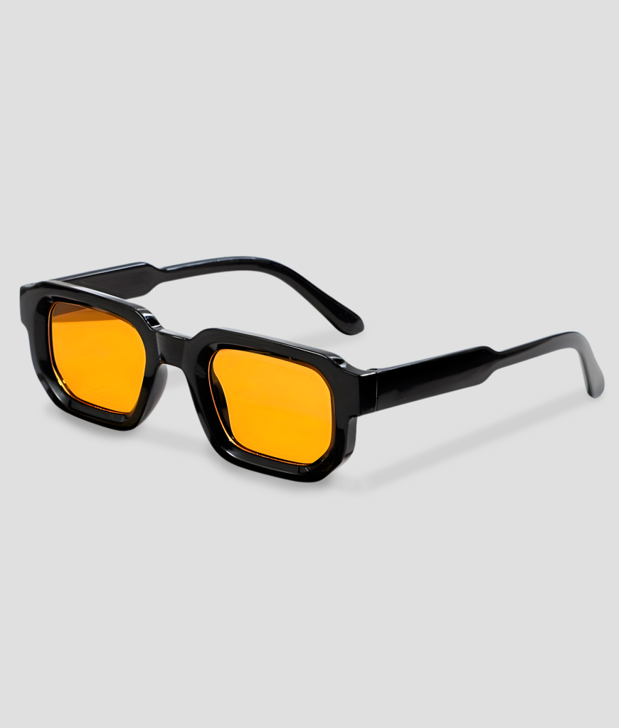 Zwarte zonnebril met rechthoekig model en oranje glazen. Opvallend en strak.