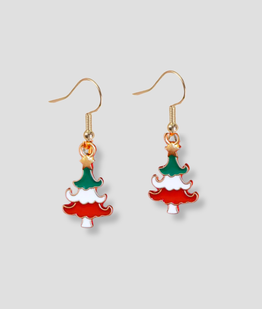 Dennenboom heeft een eigenwijze, bijna dansende vorm die meteen opvalt. De gelaagde kleuren — groen, wit en rood — geven die klassieke decembervibe, maar dan met een creatieve draai waardoor het net wat speelser wordt. Alsof iemand een kerstboom uit een tekenfilm heeft geplukt en er oorbellen van heeft gemaakt, zonder dat het kinderachtig voelt. De boompjes hebben een levendige uitstraling die laat zien dat jij klaar bent voor een avond vol gezelligheid.