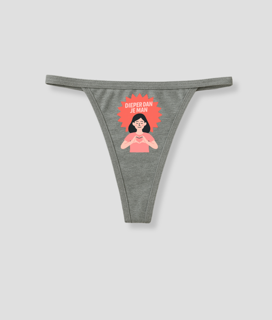 Deze grijze string met de tekst “Dieper dan je man” zegt genoeg zonder dat je iets hoeft toe te lichten. Brutaal, speels en met precies de juiste dosis zelfvertrouwen. Perfect voor wie humor graag een tikje scherp houdt.