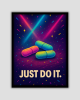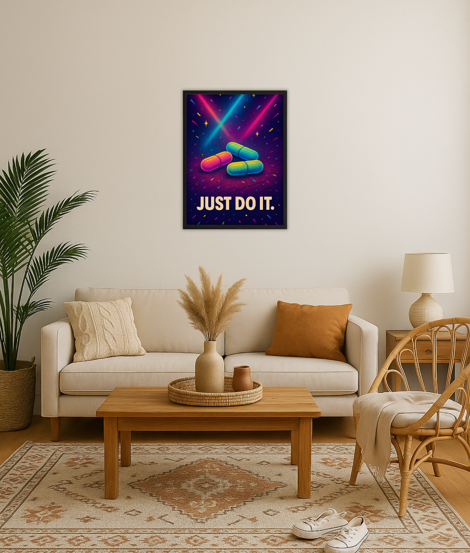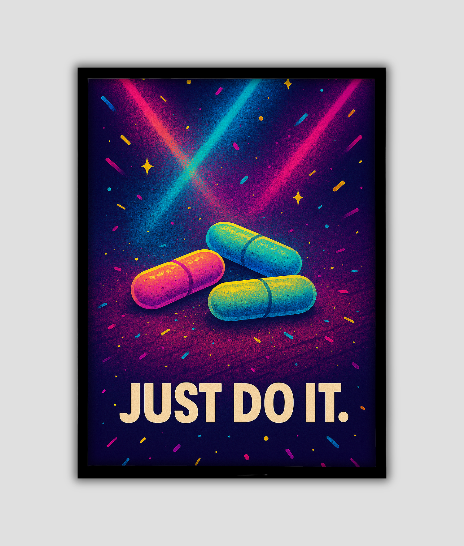 Lijst met drie kleurrijke capsules onder neonlasers en de tekst “JUST DO IT.” Fel en speels, duidelijk een knipoog naar de rave-aesthetic.