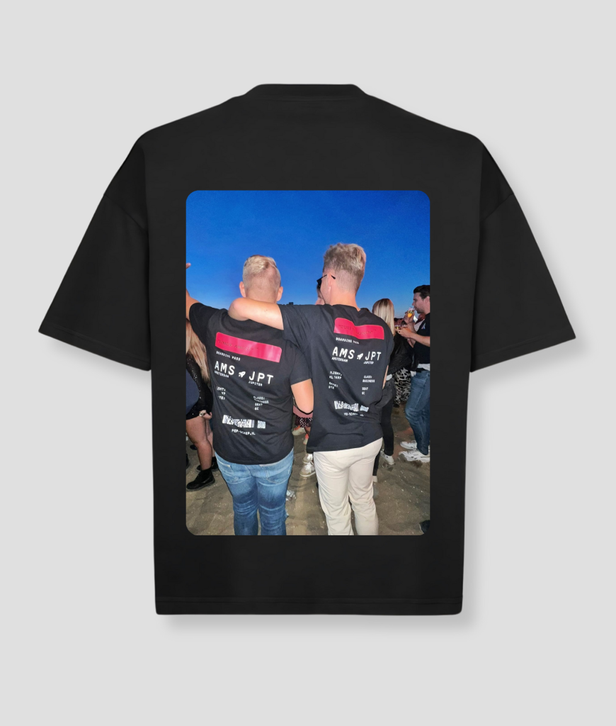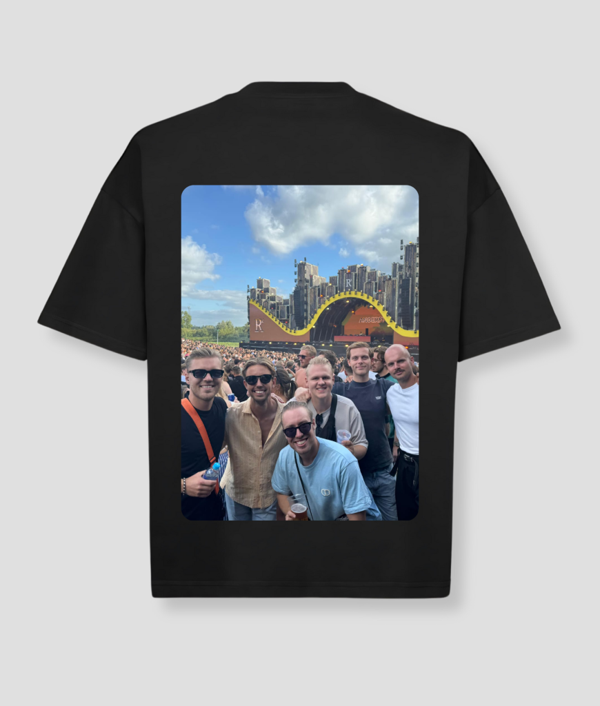 De foto wordt groot geprint zodat hij direct opvalt. Geen klein plaatje, maar een duidelijke backprint die gezien mag worden. Perfect voor foto’s, feestjes en festivals.