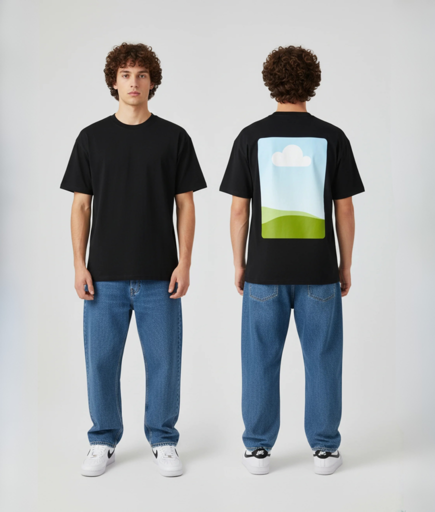 Dit oversized T-shirt draait om jouw foto. Groot op de rug gedrukt, strak gecentreerd. De voorkant blijft clean. Jij levert de afbeelding aan, wij doen de rest.