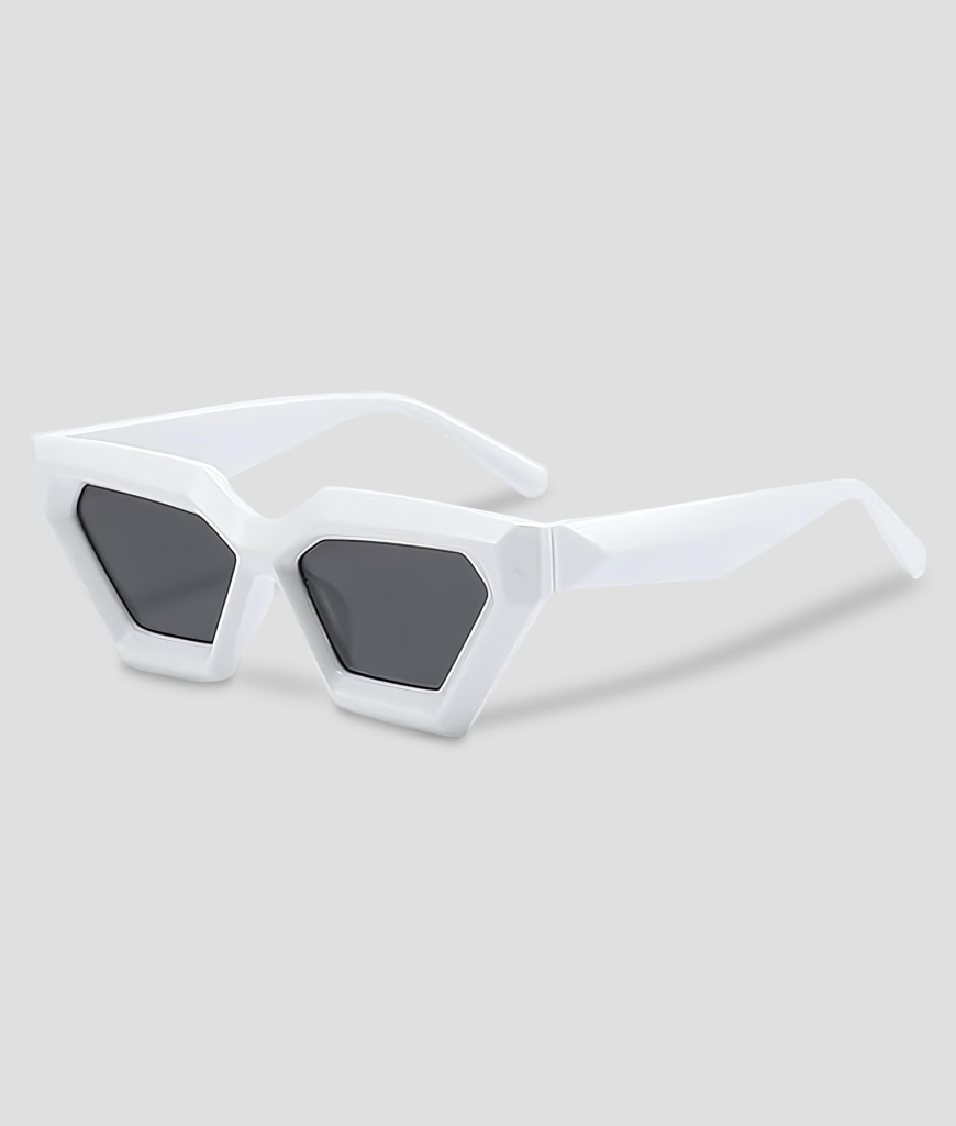 Eldoria is geometrie met lef. Die scherpe, zeshoekige lenzen in een kristalwitte frame snijden dwars door de massa. Het oogt als futuristische architectuur op je gezicht: clean, glanzend en net brutaal genoeg om een dj-tafel stiller te krijgen. Wit is hier geen safe keuze—het is een spotlight. Onder de lasers vangt de rand het licht, op de dansvloer lijk je het licht. Het is de bril die fluistert “ik kom voor de stage” zonder dat je een woord zegt. Retro? Een beetje. Modern? Volledig. Herkenbaar? Vanaf honderd meter, amigo.