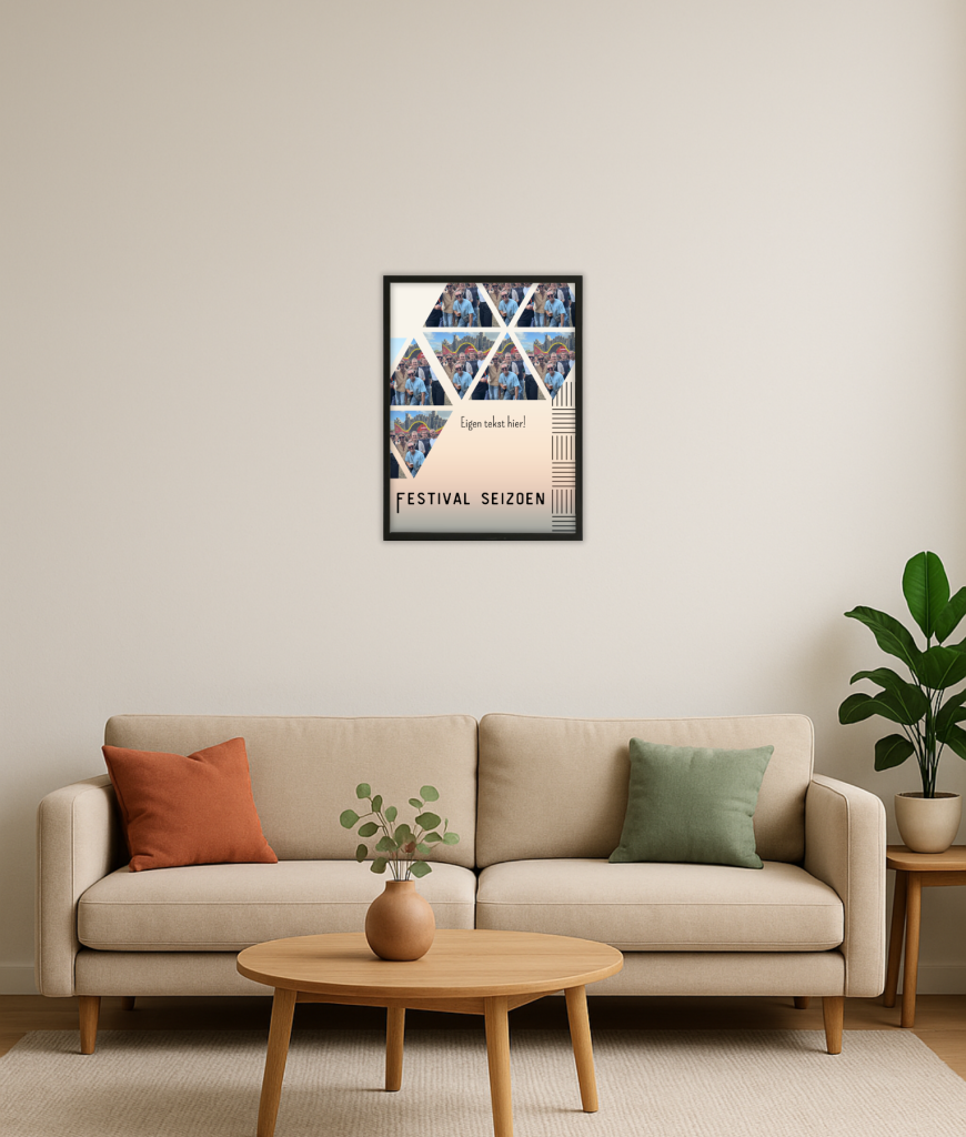 Een poster die precies past bij de sfeer van een goed festivalseizoen. Het ontwerp bestaat uit strakke driehoeken met ruimte voor meerdere foto’s, waardoor het er meteen speels en modern uitziet. Perfect om je kamer een beetje die festival-chaos en gezelligheid te geven.