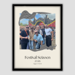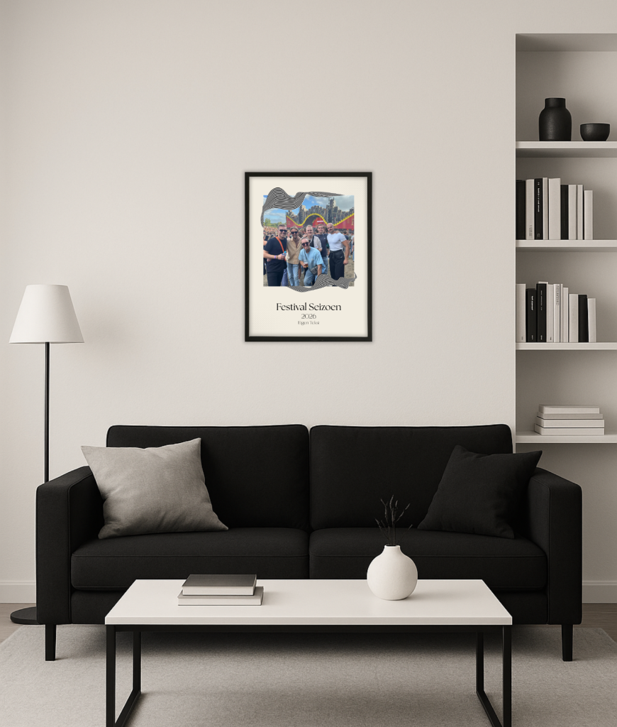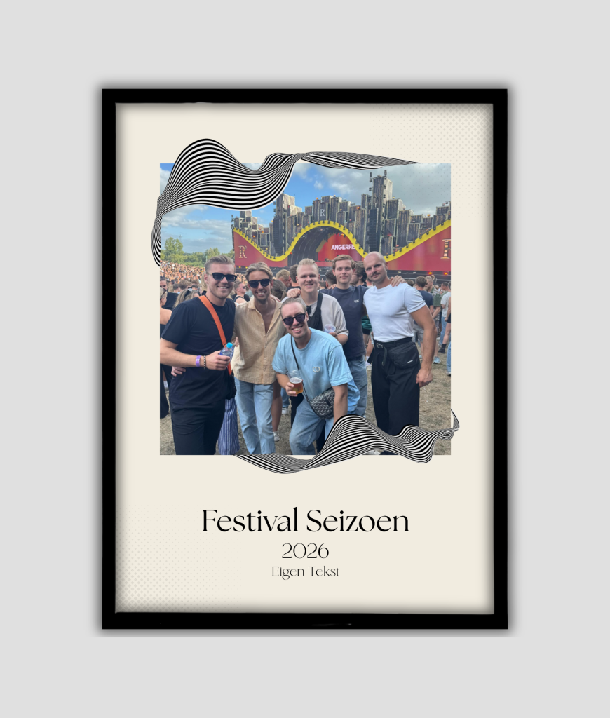 Deze poster geeft je festivalfoto een strakke, moderne look. Het golvende lijnontwerp rondom de afbeelding maakt ’m net even anders dan de standaard fotoprint. Het voelt clean, maar alsnog speels genoeg voor iedereen die iets unieks aan de muur wil.
