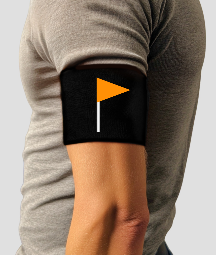 Dit is de Flag. De band voor de leider die geen rode vlaggen ziet. Deze aanvoerdersband is voor de leider die geen rode vlaggen ziet. Met een oranje vlag erop, symboliseert deze band de “Orange Flag” voor wie relaties door een andere bril bekijkt. Perfect voor Koningsdag en festivals!