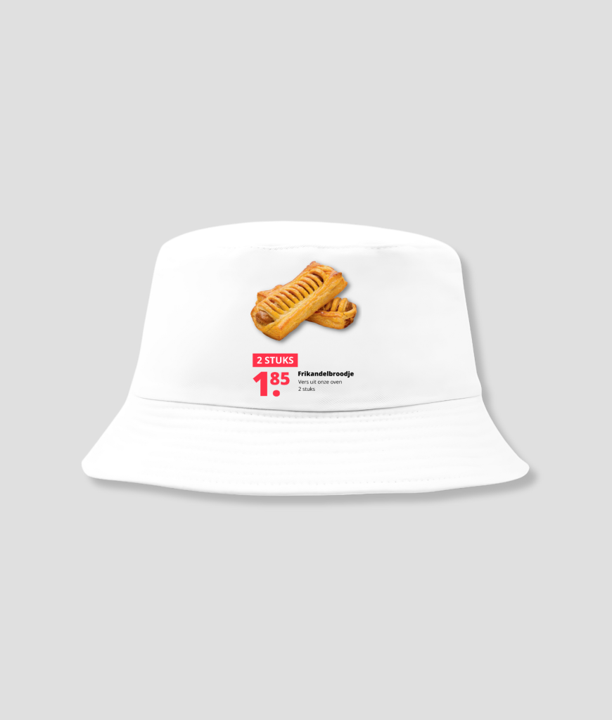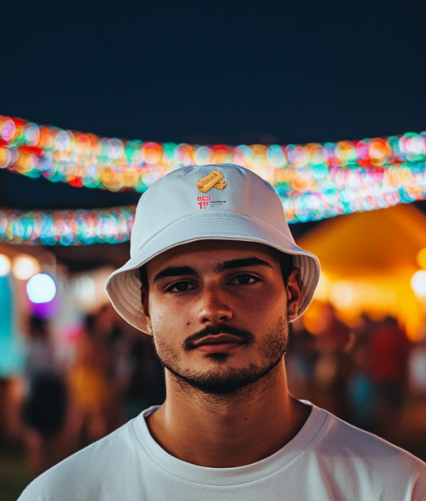 Breng je snack-game naar een hoger niveau met deze witte buckethat, versierd met een frikandelbroodje! Perfect voor de culinaire fans en festivalgangers die een knipoog willen geven naar hun favoriete snack. Deze hoed is niet alleen een stijlstatement, maar ook een gespreksstarter. Zet ‘m op, en laat je liefde voor de frikandelbroodjes zien met een flinke dosis humor en flair!
