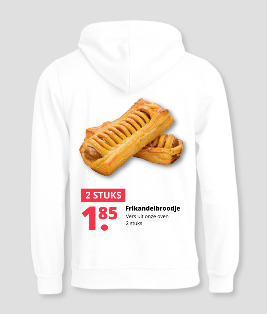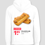 De Frikandelbroodje Hoodie is een gedurfde en humoristische keuze voor iedereen die van snacks houdt. Het ontwerp lijkt op een supermarktaanbieding en toont een versgebakken frikandelbroodje met de tekst “2 STUKS 1,85”, wat zorgt voor een grappige en herkenbare uitstraling. Dit ontwerp is ideaal voor wie van mode houdt met een knipoog.