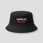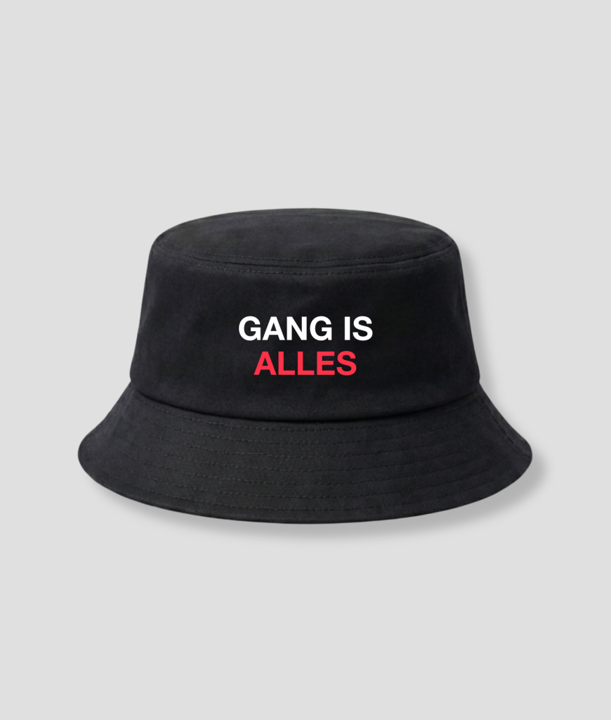 Je krijgt een zwarte bucket hat van stevige stof die goed in model blijft. Op de voorkant staat “Gang is alles”, waarbij het woord “alles” in rood is gedrukt voor extra contrast. De print is strak en goed zichtbaar.
