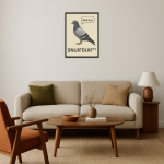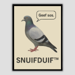 Amigo, dit is de Geef sos poster. Je zoekt geen subtiliteit en je hebt geen geduld voor saaie aardsheid. Met de korte tekst “Lijst met een duif, tekstballon “Geef sos” en de titel “SNUIFDUIF™”” is de toon direct gezet. Dit is jouw keuze voor maximale impact en een absurd, droog en duidelijk satirisch kunstwerk.
