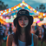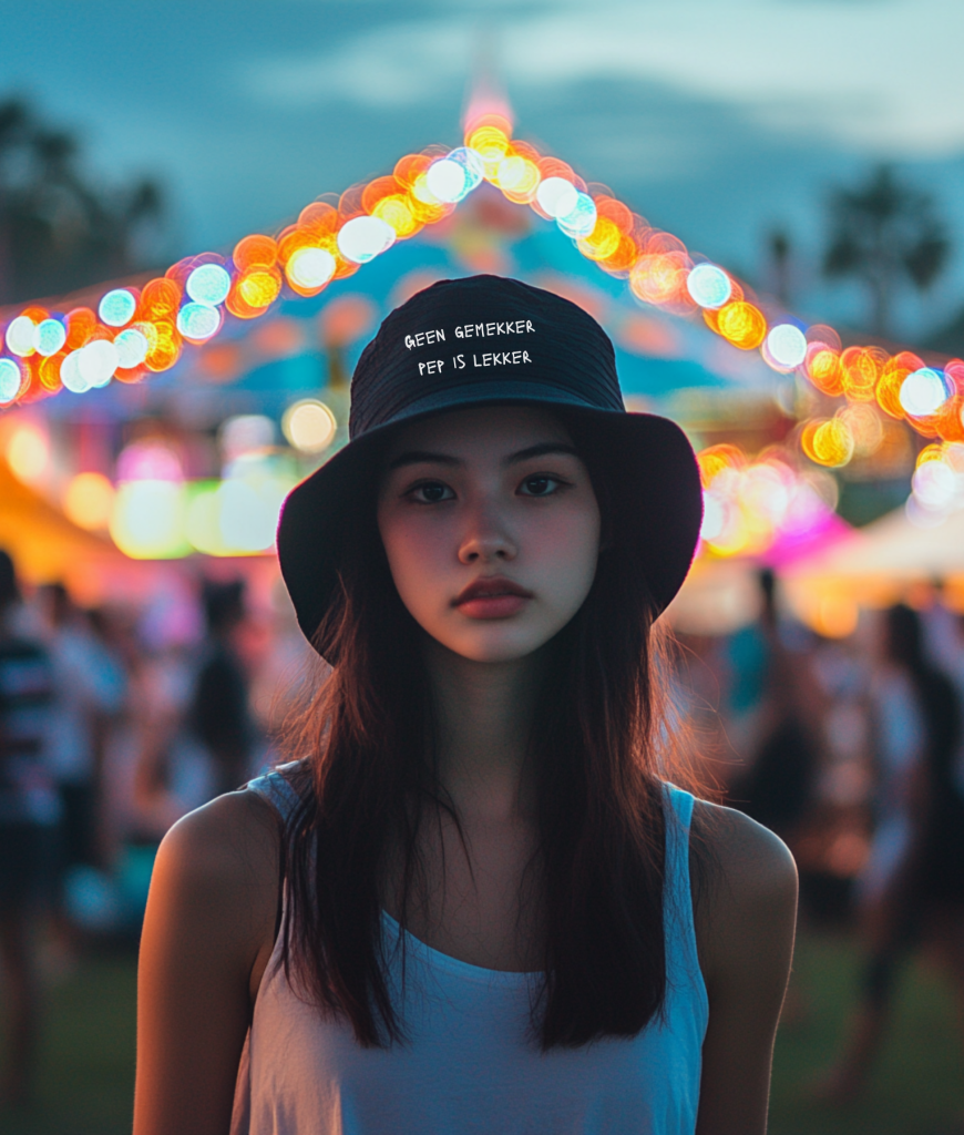 Geen gedoe, geen gezeur, gewoon gaan. Jij stapt het terrein op met de schouders los en het hoofd koel, en deze zwarte bucket hat sluit daar naadloos op aan. Van een zonnige middag in het park naar een techno-nacht die onverwacht doorrolt, van hardstyle-front row naar een vroege trein met slaperige glimlach—je draagt ‘m en je weet: het weekend is geen plan, het is een verhaal. Jij gaat niet voor half werk, maat, en dat zie je.