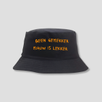 Op een strak zwarte basis staat de tekst “GEEN GEMEKKER” in levendig oranje, simpel maar krachtig. Aan de onderkant, als een speelse knipoog, lees je “MIAUW IS LEKKER” – een beetje humor mag niet ontbreken. Het is de bucket hat die zowel speels als serieus genoeg is voor de party die geen gedoe tolereert. De felle oranje letters springen eruit zonder te schreeuwen en maken de statement duidelijk: jij hebt geen tijd voor negativiteit.